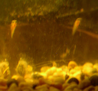 När Red fött färdigt så håvade jag över henne till ett annat kar så ynglen (är100% på att det är minst 6 yngel) får en chans. Här kommer några bilder, oskarpa, men med lite fantasi och vägledning av vackra paint-pilar så kan man få en hum om deras storlek och utseende.